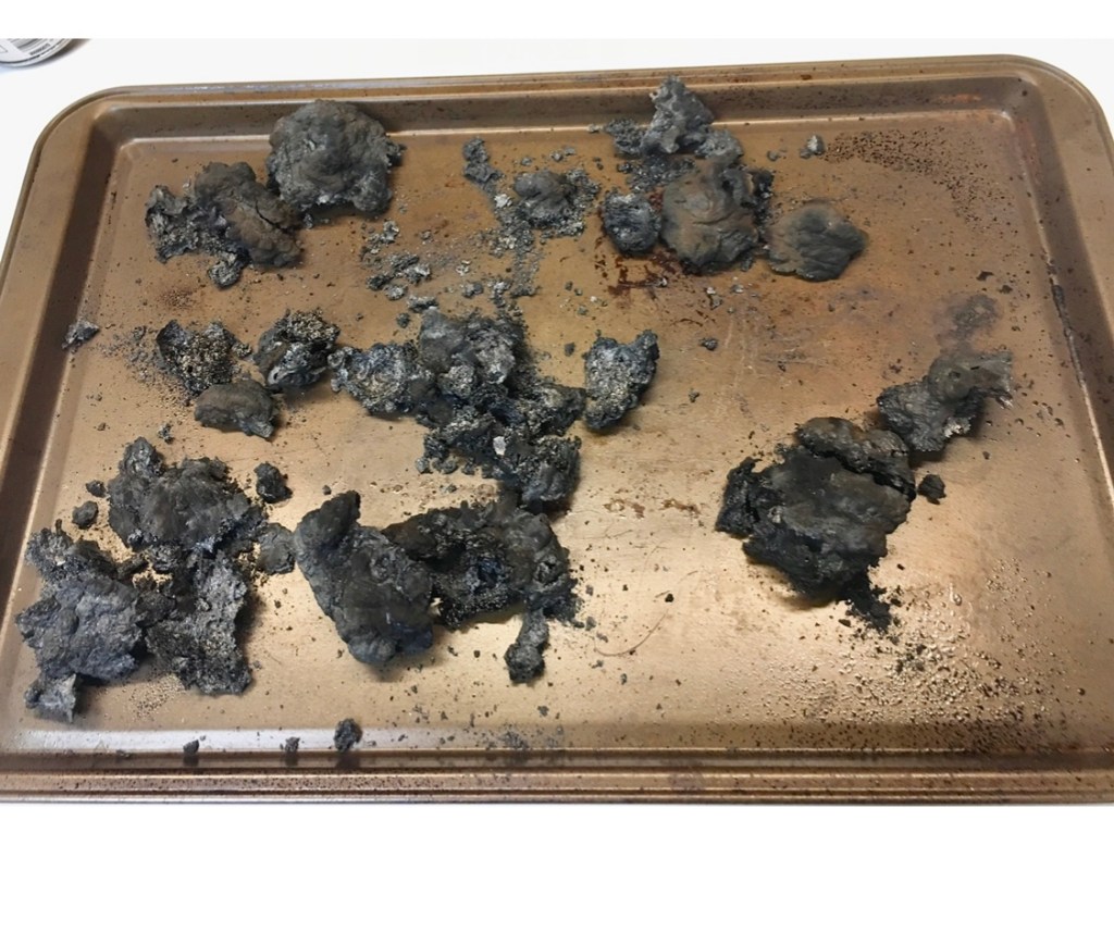 He rescued the bird remains and put them on a baking sheet, then photographed them for posterity. I may be biased but I think it could pass as fancy sculpture except they went straight into the trash (after they had stopped smoking and cooled off).